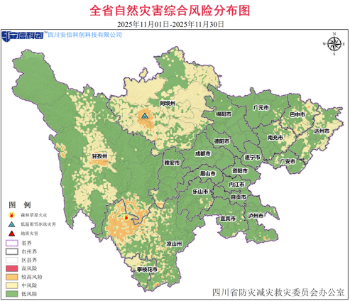 日前,四川省防灾减灾救灾委员会办公室印发《2025年11月份全省自然灾害综合风险分析报告》。综合研判认为,11月份应重点关注的自然灾害综合风险如下:攀西地区西北部、川西高原西南部主要致灾因子为森林草原火灾,其中凉山州西北部、甘孜州西部和南部等地风险较高;川西高原北部、中部主要致灾因子为低温雨雪冰冻灾害,其中阿坝州西部、甘孜州北部等地风险较高。