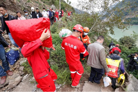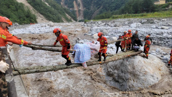 英勇的救援队伍紧握绳索攀爬过江、抬着老乡踏过树枝“桥梁”、不顾生死深夜乘舟转运,逢山开路、遇水架桥,如同当年红军急行军,争分夺秒向被困群众挺进。