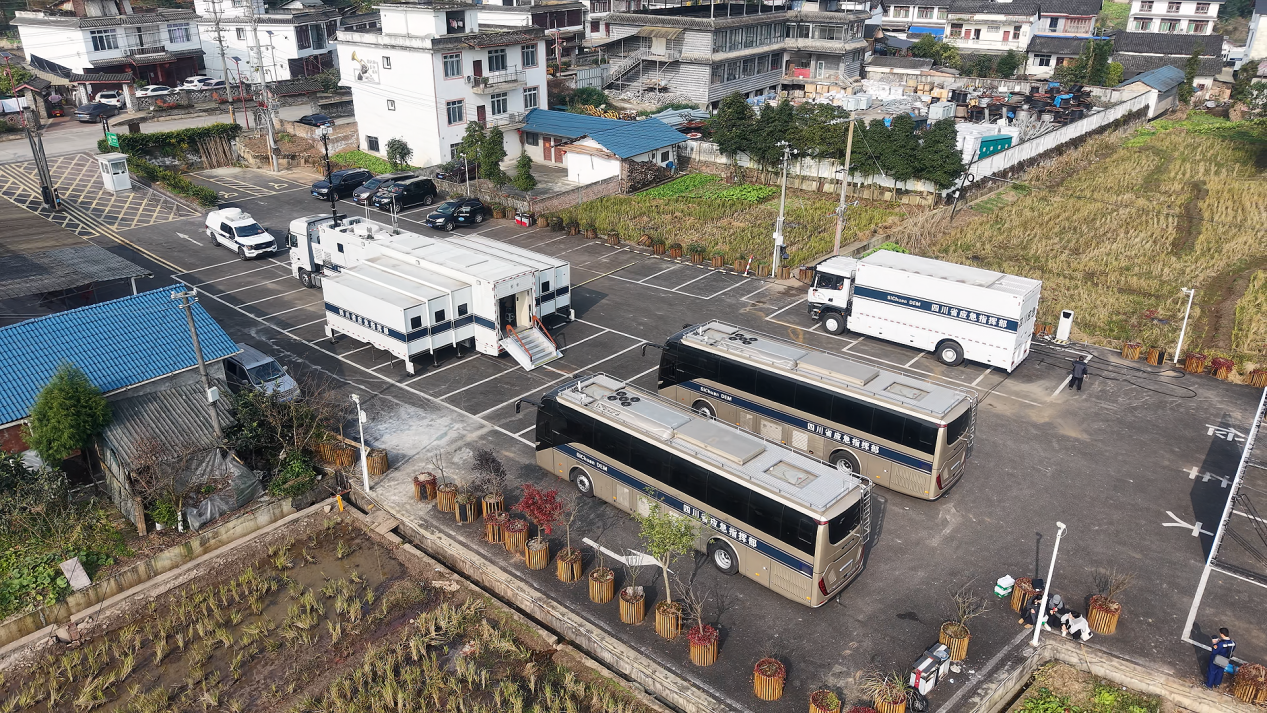 省级救援力量抵达灾害现场后,队员们即刻启动前方指挥部搭建工作,各类特种车辆依次驶入现场,应急方舱车率先展开模块化车厢组建,餐车、宿营车同步卸置生活救灾物资,配电车也快速完成供电接驳。