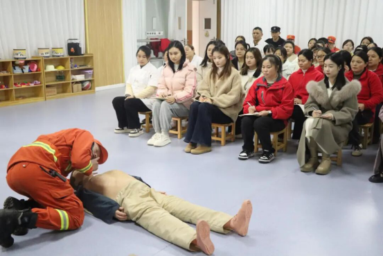 支队指战员通过生动案例和互动问答,向师生普及日常安全知识,重点强调预防火灾的措施及逃生技巧,并对安全用电规范进行了演示,提醒幼儿远离插座、电线等危险源。针对幼儿常见意外(噎食、跌倒、烫伤等),对教师开展了海姆立克急救法分步教学,以及心肺复苏(CPR)操作及AED使用要点。针对校园安保团队进行消防栓的启动与维护,消防监控室设备操作及火警响应流程以及干粉灭火器的操作及日常维护专项培训。